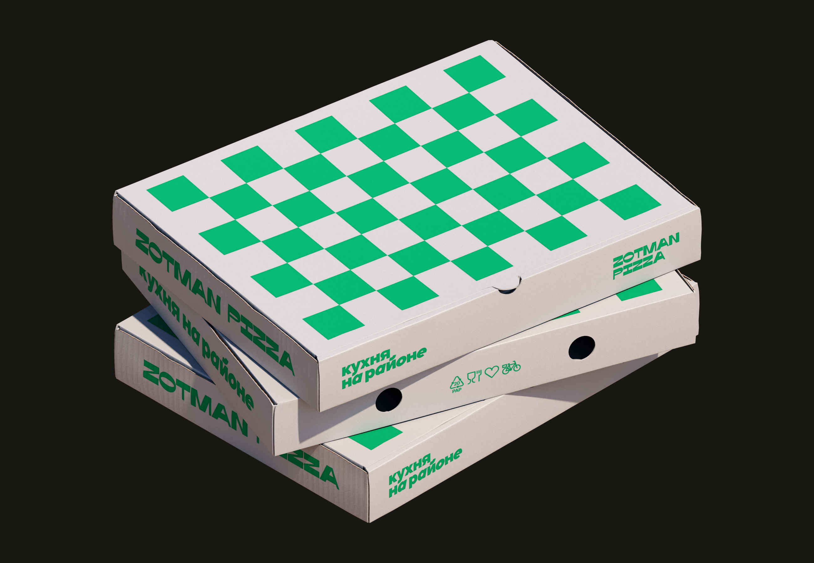 contains a plastic bag with a checkerboard seal in which there is a hot cardboard box with a checkerboard seal in which there is sliced pizza